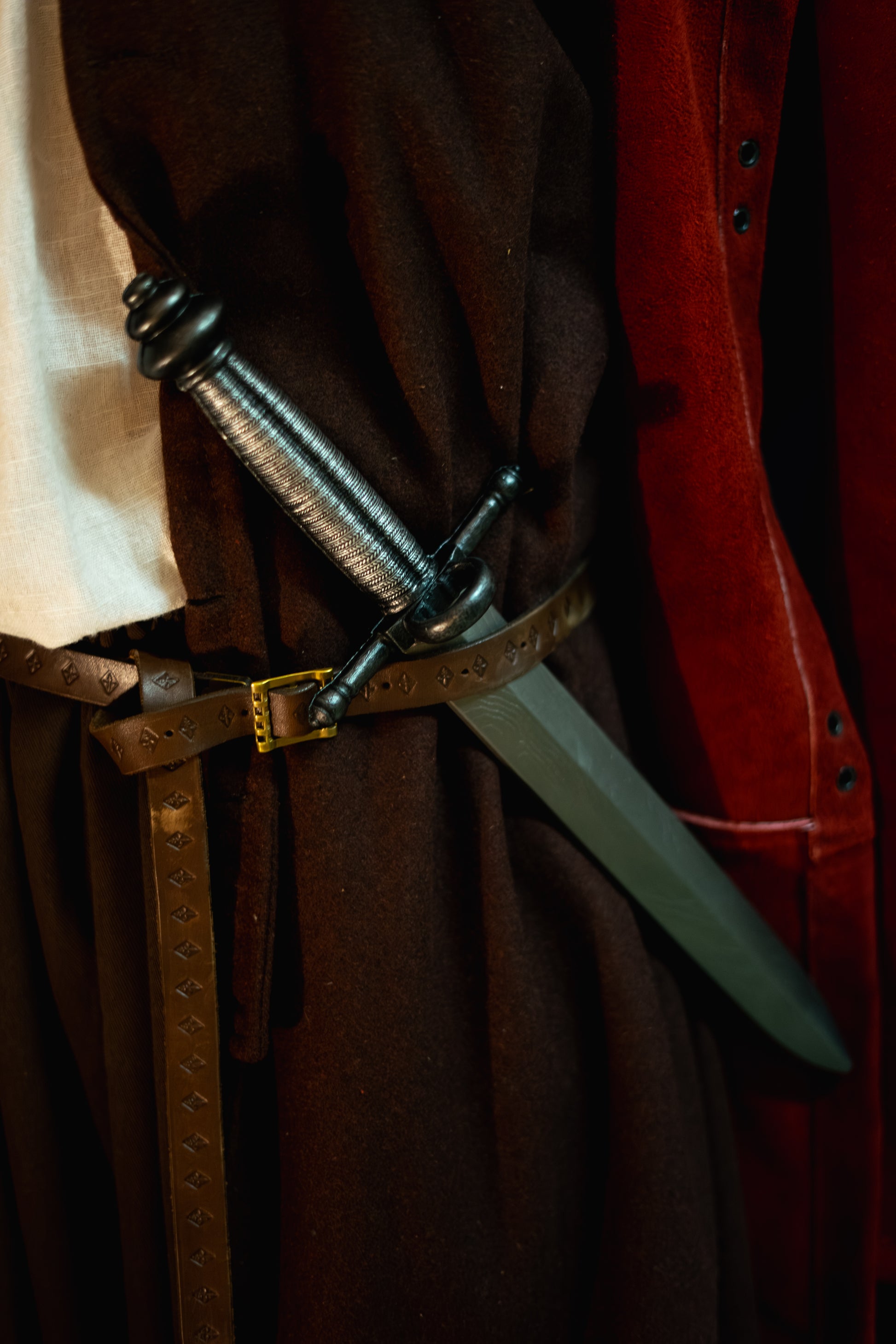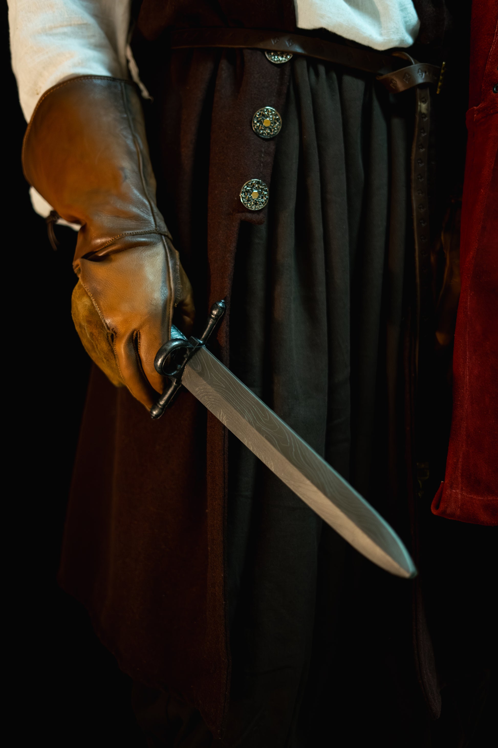 der Knauf des langen Dolches aus geschwärztem Stahl.