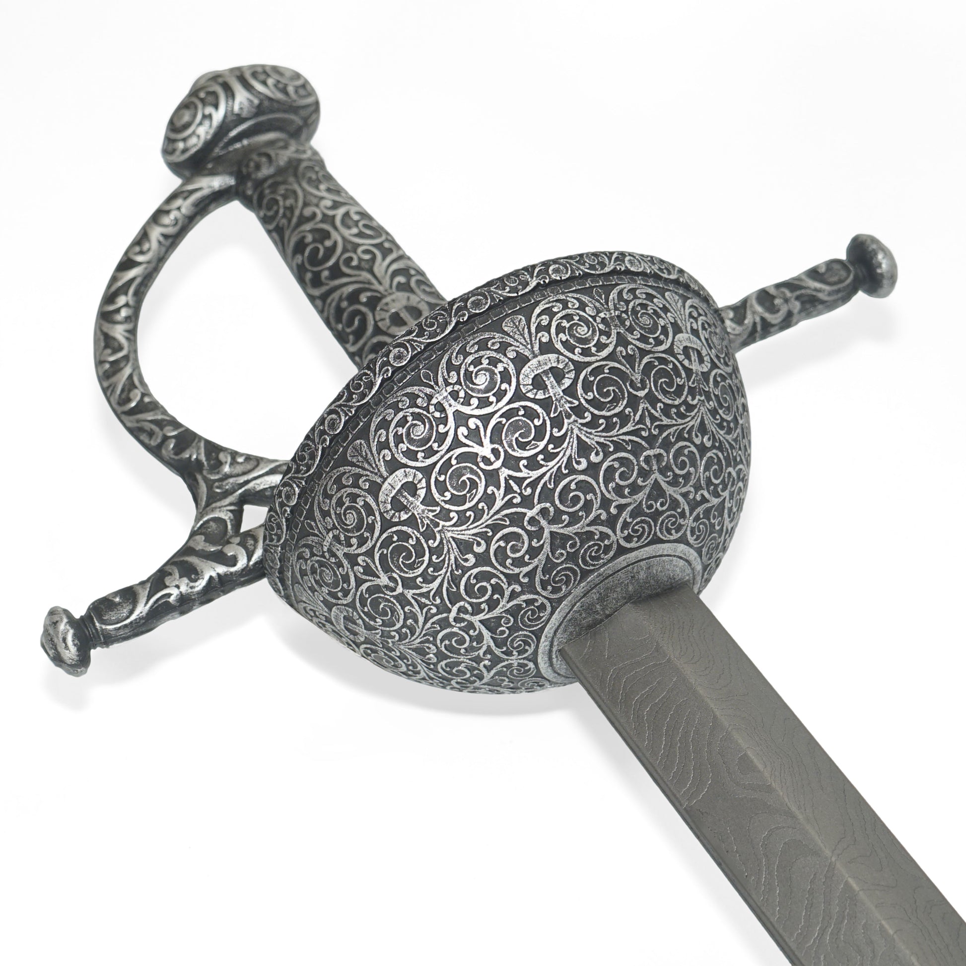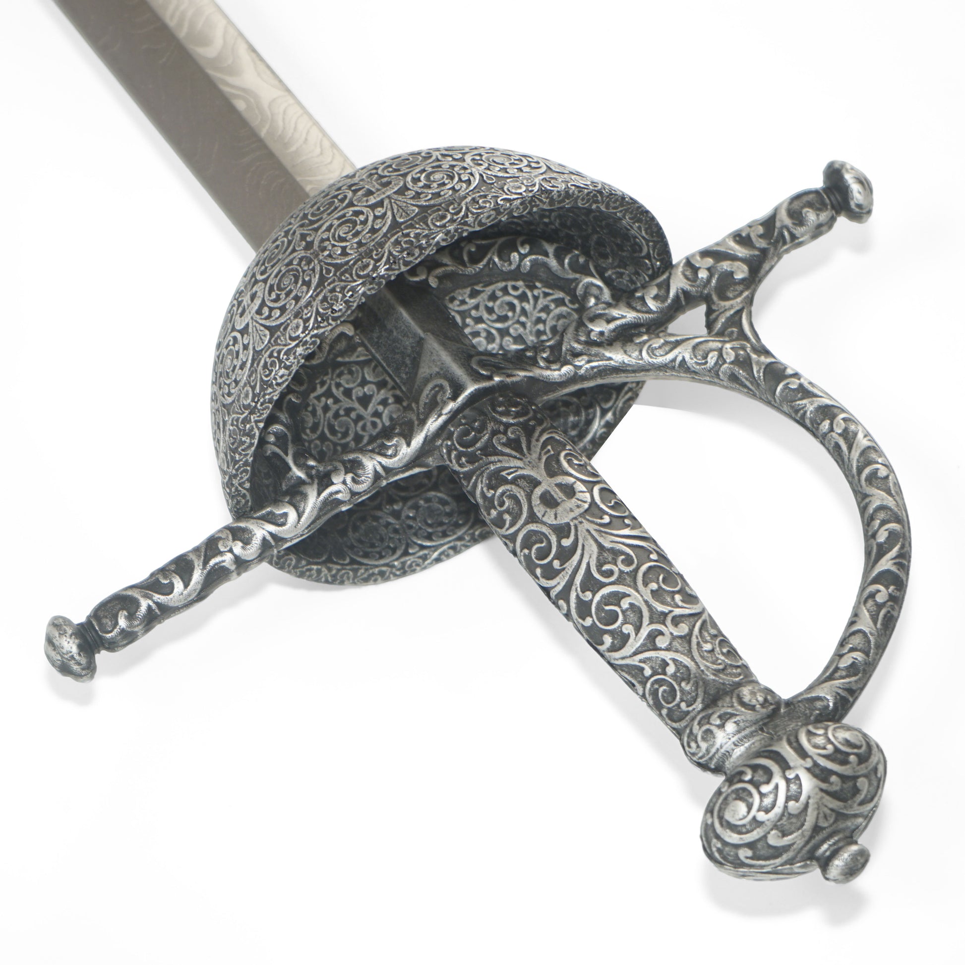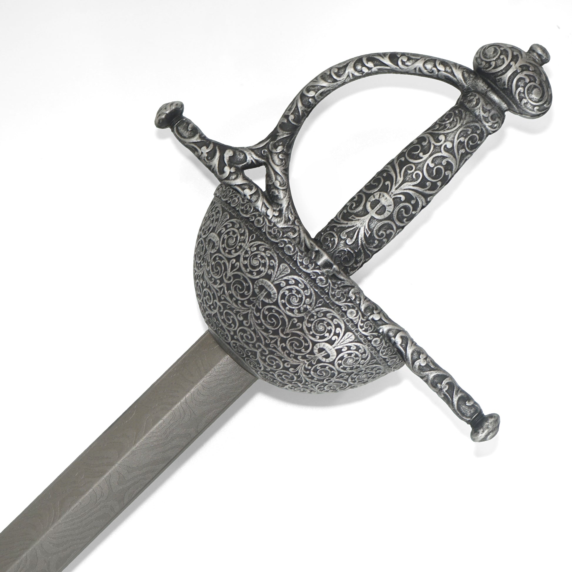 Il design di questo stocco Spanish Thrust con elsa a coppa si basa sull'arte della spada spagnola del XVI secolo. Gli stocchi spagnoli erano noti per la loro forma di elsa chiusa chiamata elsa a coppa, progettata principalmente come spada da duello. Sebbene lo stocco con l'elsa a coppa fosse occasionalmente portato in battaglia, non era destinato all'uso militare. Gli esemplari di alta qualità venivano tipicamente realizzati per i gentiluomini e usati come stocchi da duello. La coppa è finemente decorata con disegni a volute e la guardia a croce ha una forma a spirale contorta.